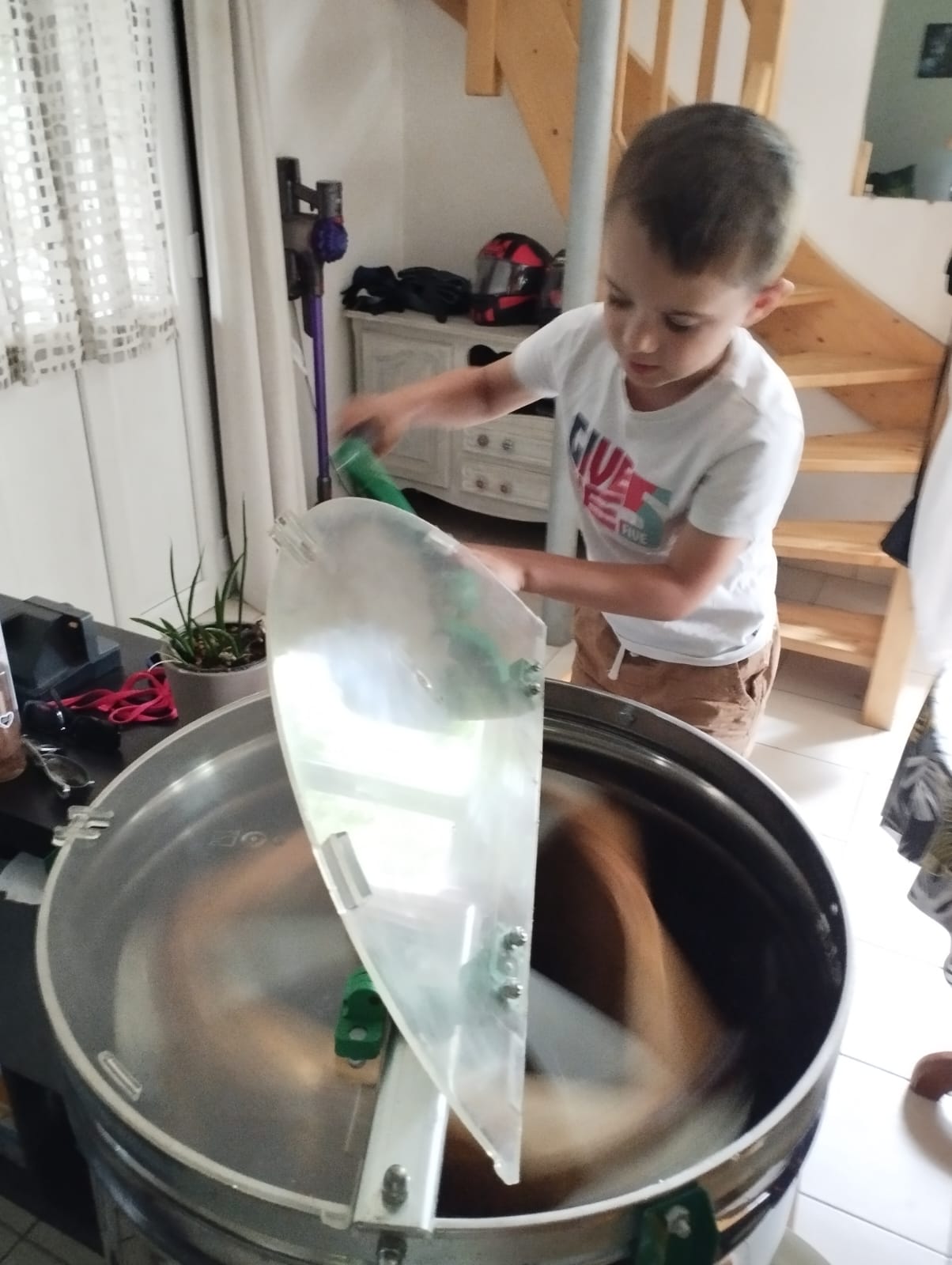 Extraction chez Evelyne avec 3 générations d'apiculteurs "CLAVER"